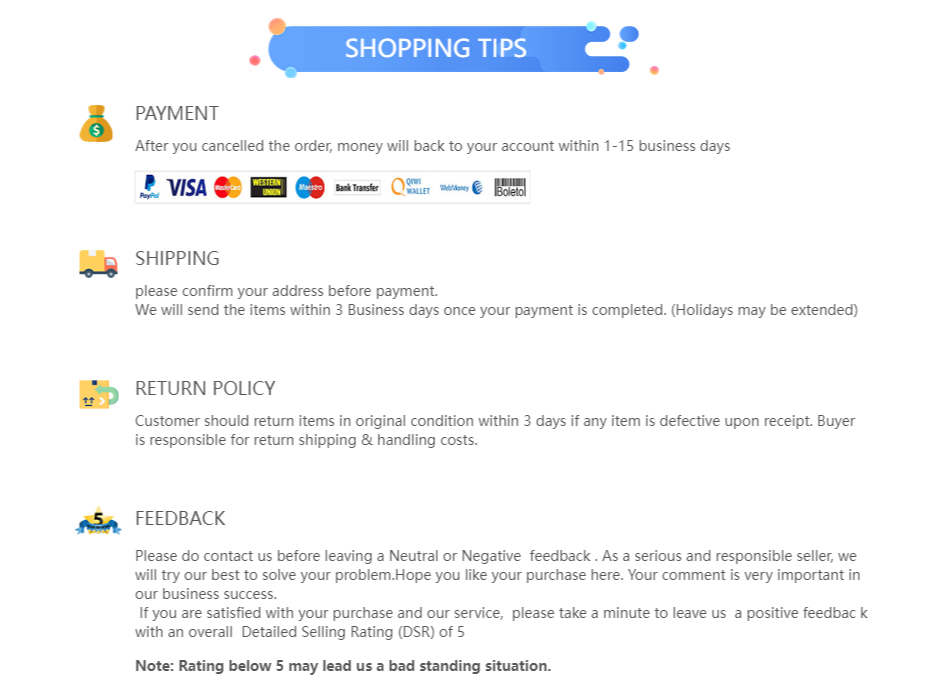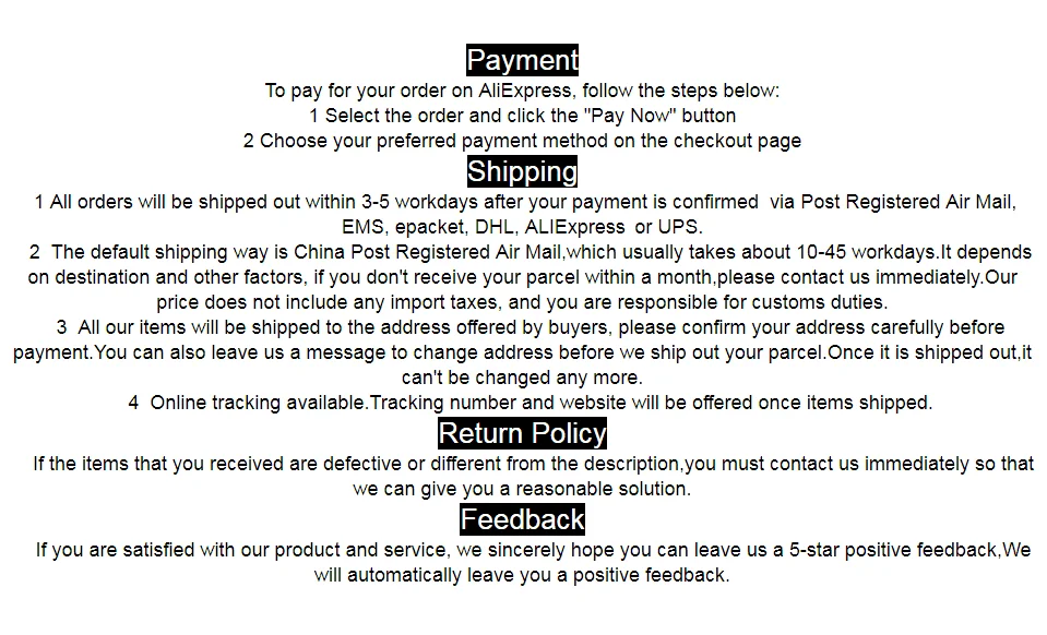 4.Some products in this shop are not mailed in some countries. If you order a large amount, but you think the freight is expensive, you can place the order first and do not pay. I will modify the price to give you a discount. After the modification is completed, you feel satisfied with the price and then pay.